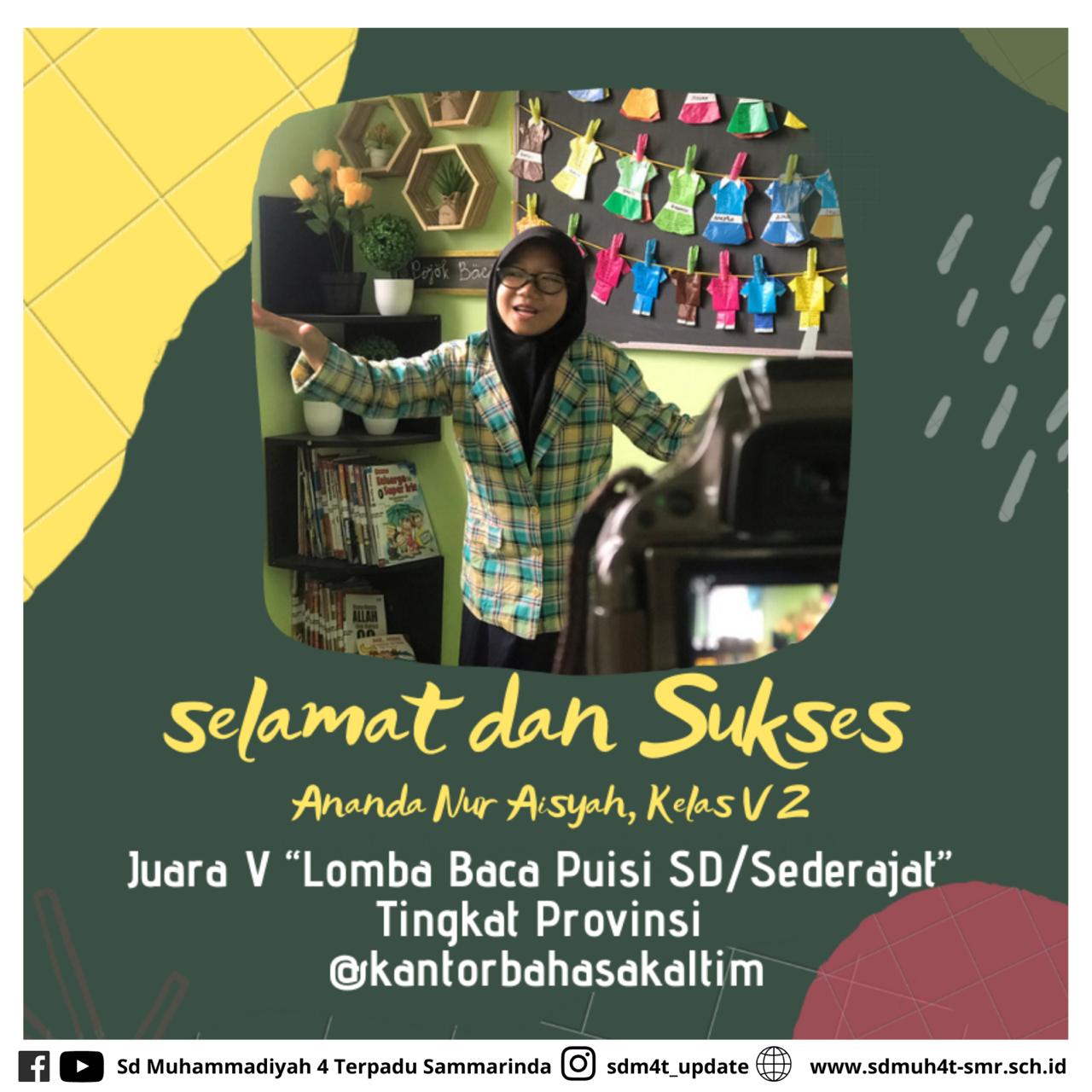 Selamat dan Sukses ananda Nur Aisyah kelas V SD Muhammadiyah 4 Terpadu Samarinda meraih juara ke V dalam lomba Baca Puisi SD/ Sederajat Tingkat Provinsi yang di adakan oleh Kantor Bahasa Kalimantan Timur dalam rangka memperingati "Bulan Bahasa dan Sastra".