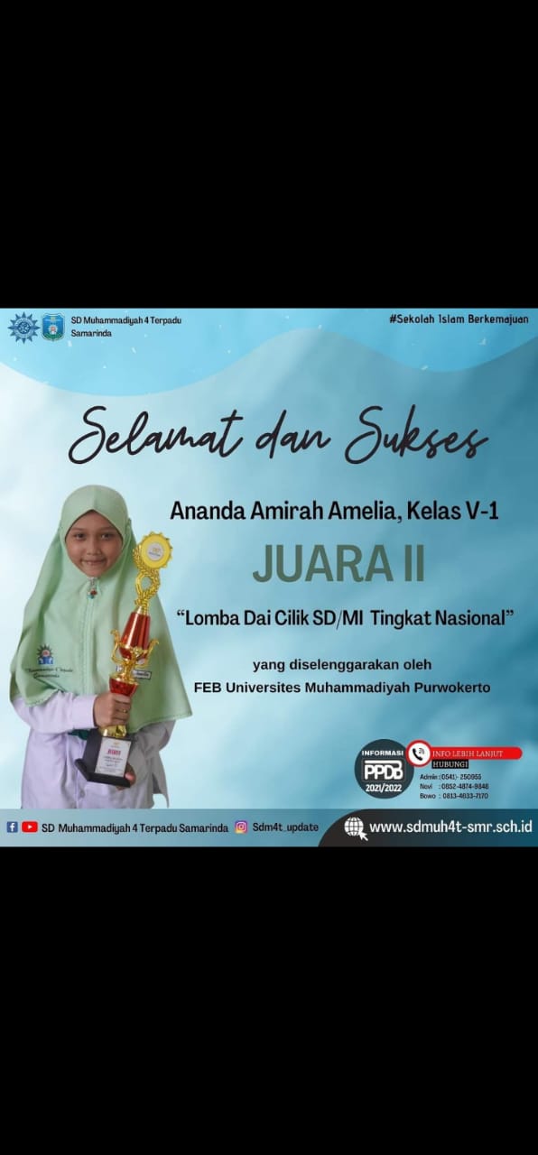 Selamat dan Sukses ananda Amirah Amelia kelas V SD Muhammadiyah 4 Terpadu Samarinda meraih juara ke II dalam Lomba Dai Cilik SD/MI Tingkat...
